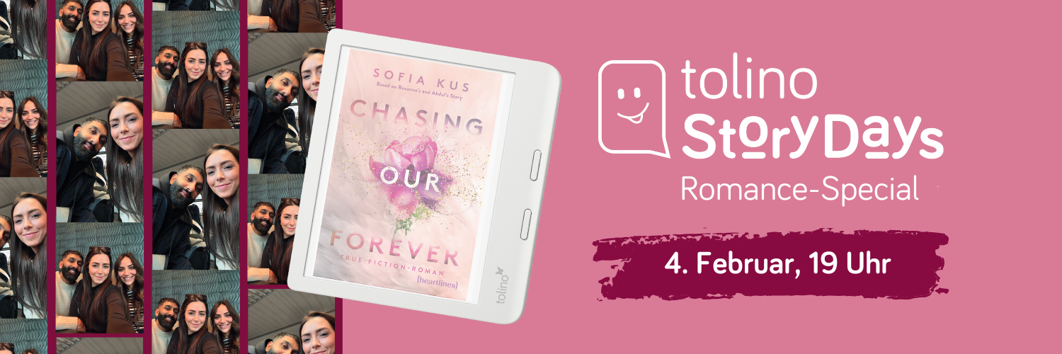Die tolino StoryDays sind zurück! Dieses Mal erwartet Sie ein besonders emotionaler Talk mit der Romance-Autorin Sofia Kus und dem echten Liebespaar hinter ihrem neuesten Roman: Roxy und Abdul, die gemeinsam die Inspiration für „Chasing our Forever“ (erschienen im “heartlines” Verlag) geliefert haben.