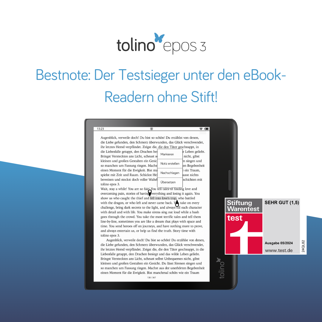 Im eBook-Reader Test 2024 des Stiftung Warentest wurden 33 eBook-Reader (ohne Stiftnutzung) getestet. Im Test sind amazons Kindle-Geräte und Modelle von Pocketbook, Kobo, Lenovo, Remarkable sowie tolino. Der epos 3 von tolino landet mit dem Test-Qualitätsurteil "sehr gut (1,5)" auf dem geteilten ersten Platz.