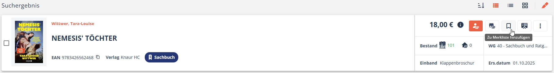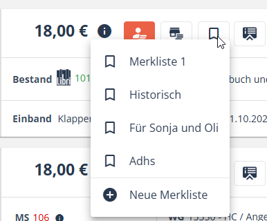 Ist ein Titel bereits auf einer Merkliste, erkennen Sie dies daran, dass in der Übersicht der Merklisten das Symbol vor dem Namen rot umrandet ist. Auch am Titel selbst ist das Symbol rot umrandet.