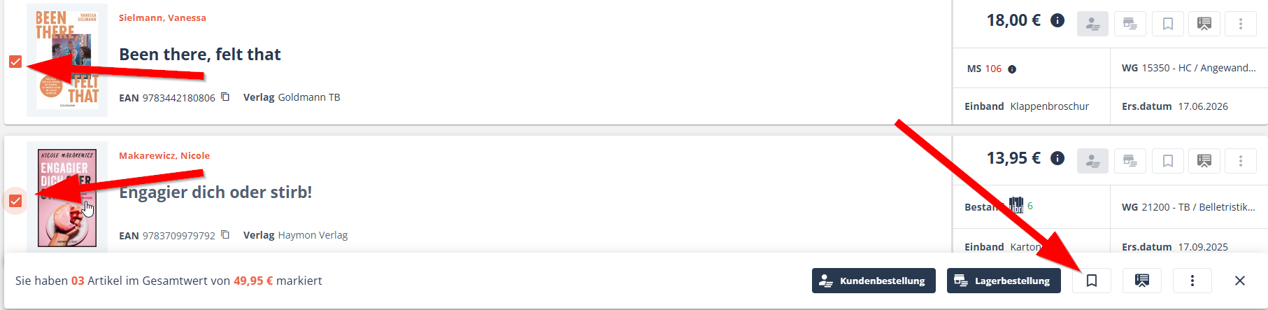 Um mehrere Artikel gleichzeitig auf eine neue Merkliste zu setzen, markieren Sie die Artikel mit der kleinen Checkbox am Anfang der einzelnen Artikel. Es öffnet sich am Fuß der Liste eine Leiste, in der Sie ebenfalls das Symbol auswählen können (rechts).