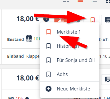 Wählen Sie statt "+Neue Merkliste" die gewünschte Merkliste aus der Übersicht aus.