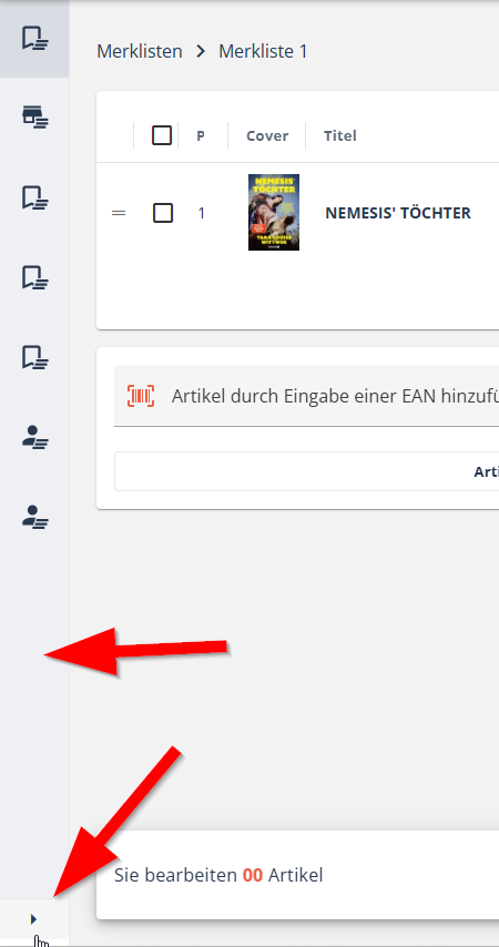 Merklisten können in der Merklisten-Detailansicht umbenannt werden. Wählen Sie eine Merkliste aus. Links sehen Sie eine Leiste mit Symbolen. Klappen Sie die Seitenleiste auf (Pfeil im unteren Bildbereich), um die Bezeichnungen der Merklisten (und angelegten Bestellungen) zu sehen.