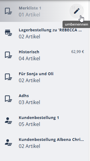 Auf dieser Seite erfahren Sie, wie Sie eine Merkliste erstellen, umbenennen und aus einer Merkliste eine Bestellung heraus generieren können.