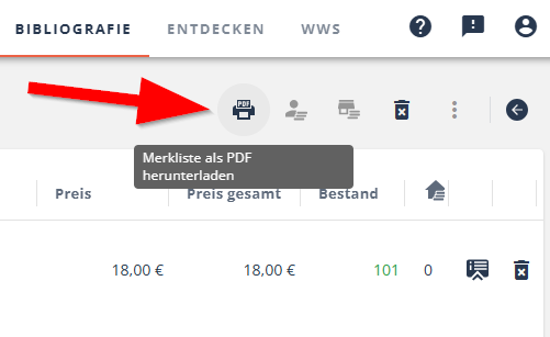 Um eine Merkliste herunterzuladen, um sie drucken zu können, öffnen Sie die Merkliste und klicken auf das Druckersymbol rechts oben.
