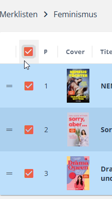 Um Titel von einer Merkliste zu bestellen, wählen die gewünschten Titel über die Checkbox an. Sollen alle Titel angewählt werden, klicken Sie die Checkbox in der Zeile mit den Spaltenbezeichnungen an.