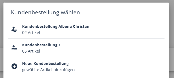 Wurde bereits eine Kunden- bzw. Lagerbestellung angelegt, aber nicht gebucht, wird diese nun aufgelistet. Wählen Sie aus den bestehenden Bestellungen aus oder wählen "Neue Kundenbestellung".