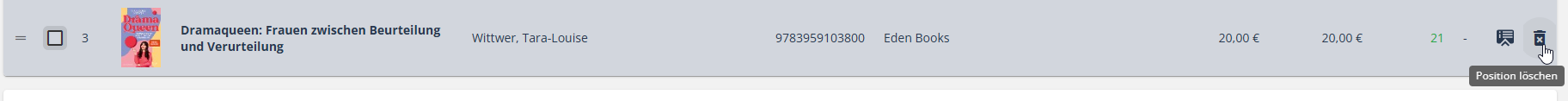 Um mehrere Positionen zu löschen, markieren Sie diese mit der Checkbox vor den Positionen. Eine Fußleiste wird angezeigt, in der Sie auf den Mülleimer klicken müssen.