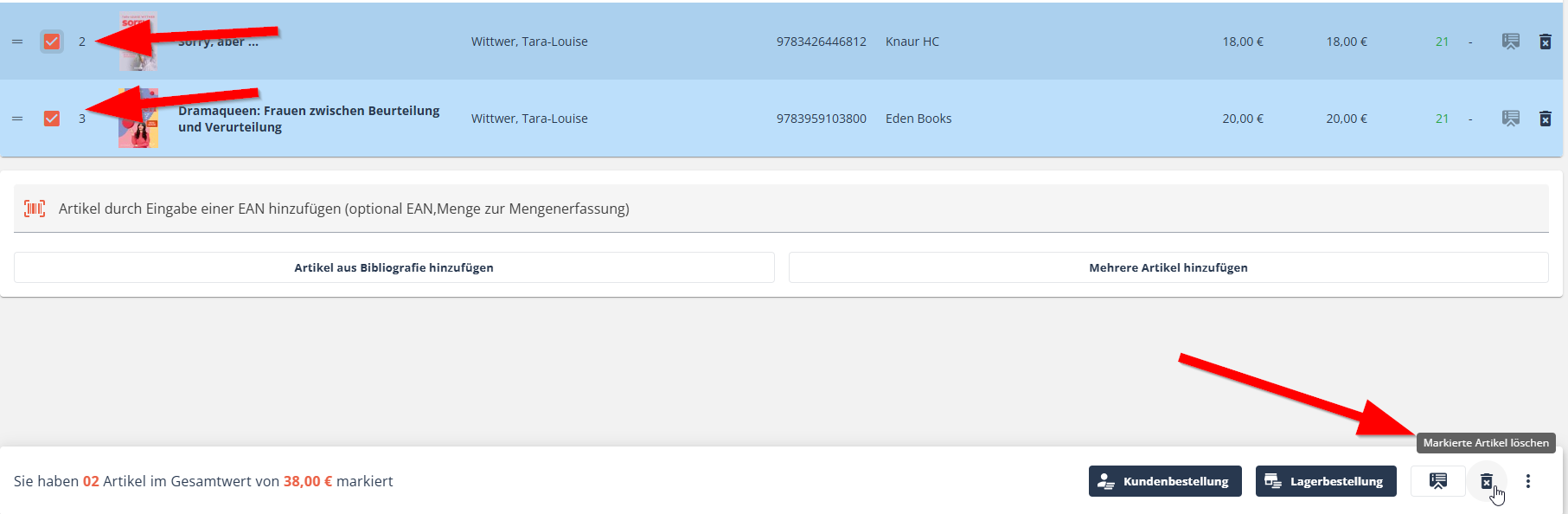 Auch hier erscheint das Pop-Up-Fenster mit der Abfrage, ob die markierten Artikel gelöscht werden sollen.