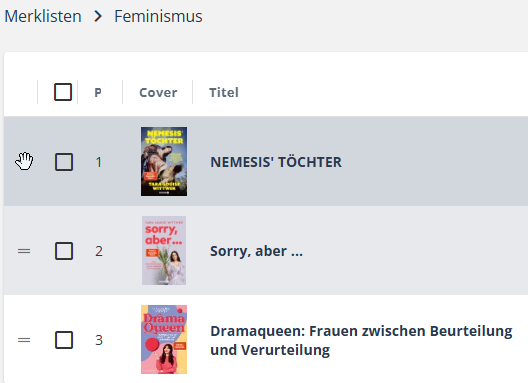 Um eine Merkliste zu sortieren, gehen Sie mit der Mouse über das Gleichheitszeichen vor einer Position, klicken dieses an und ziehen es an die gewünschte Position in der Liste. Dort lassen Sie die Mouse los.
