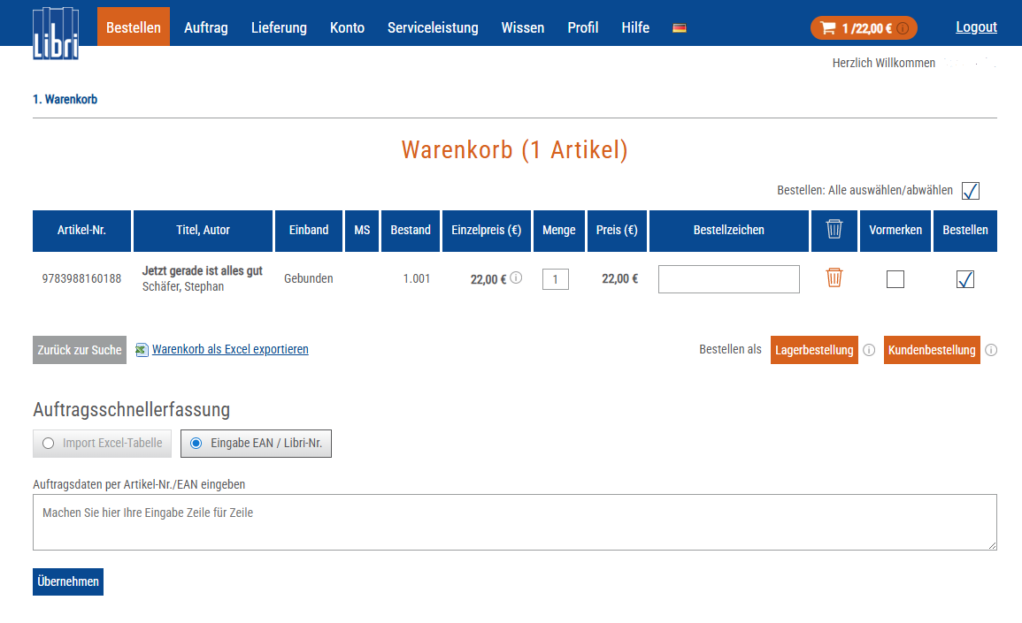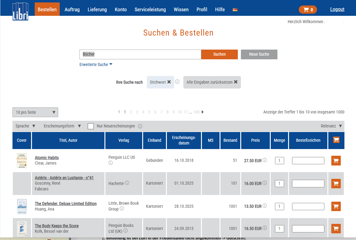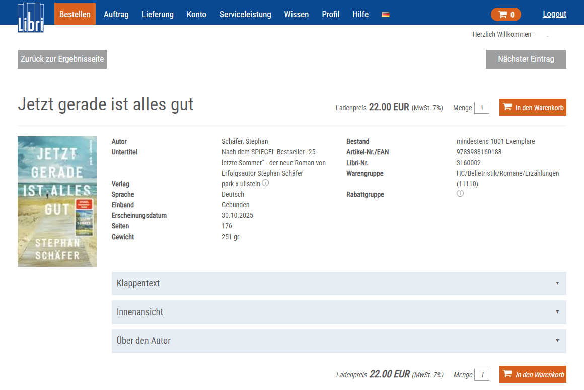 Um einen Artikel zu bestellen, klicken Sie auf die Schaltfläche „In den Warenkorb“ (rechts in der Ergebnisliste oder ober- und unterhalb der Detailansicht). Wenn Sie mehr als ein Exemplar bestellen möchten, geben Sie die gewünschte Anzahl im Feld „Menge“ ein. Sie können dies später im Warenkorb korrigieren. Nachdem Sie alle Artikel ausgewählt haben, gelangen Sie über das Einkaufswagen-Symbol oben rechts in der Menüleiste zum Warenkorb.