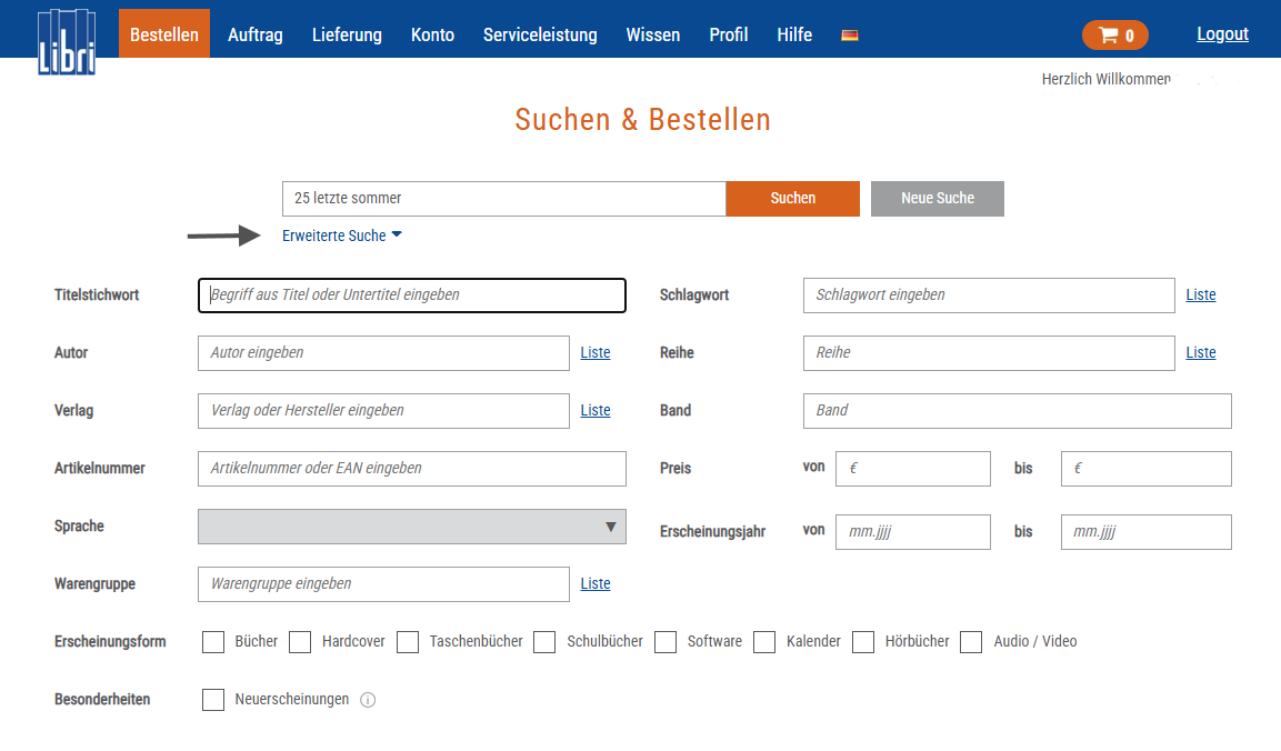 Die Katalogsuche finden Sie im Menüpunkt „Bestellen > Suche“. Standardmäßig wird die Schnellsuche angezeigt. Mit der Eingabe eines oder mehrerer Suchbegriffe durchsuchen Sie den gesamten Onlinekatalog. Berücksichtigt werden sämtliche Datenfelder, z. B. Titel, Untertitel, Autorinnen und Autoren, Verlag usw. Die „Erweiterte Suche“ bietet Ihnen zusätzliche Optionen, um Ihr Fachwissen gezielt einzusetzen.