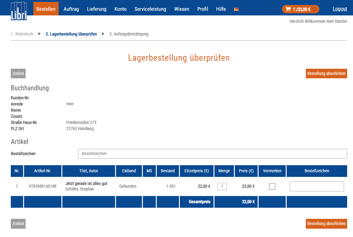 Schritt 3: Kundenbestellung prüfen – Hier wird Ihnen die Übersicht Ihrer Bestellung angezeigt. Mit einem Klick auf „Bestellung absenden“ übermitteln Sie Ihre Bestellung an Libri.