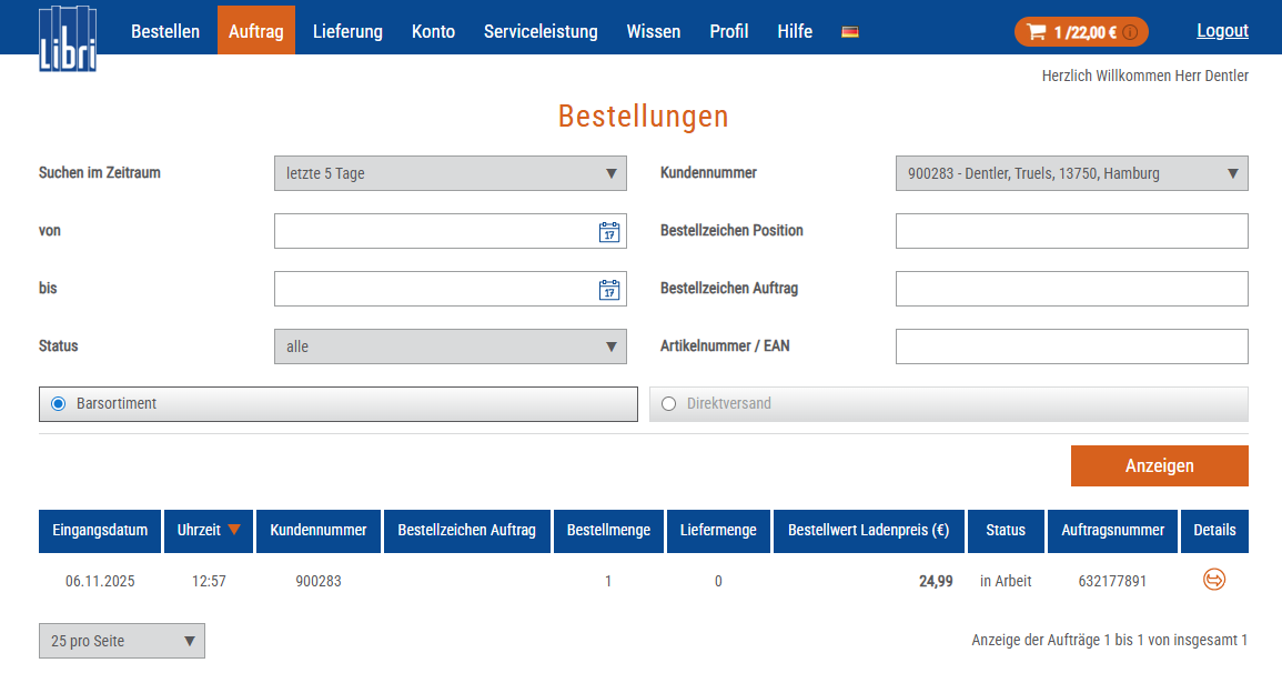 Den Status Ihrer Bestellungen können Sie jederzeit über das Menü „Auftrag > Bestellungen“ prüfen. Dort stehen Ihnen umfangreiche Suchoptionen zur Verfügung.