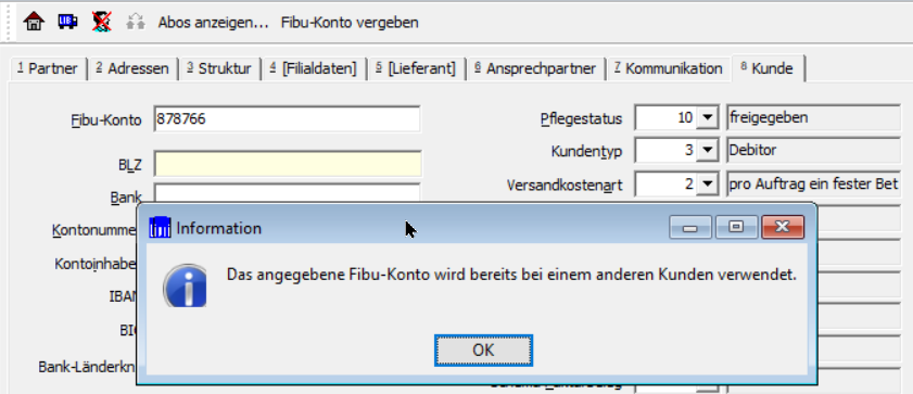 Bei der Zuweisung einer Finanzbuchhaltungsnummer (FIBU-Nummer) an einen Kunden erfolgt eine Überprüfung, ob diese Nummer bereits einem anderen Kunden zugeordnet ist. Sollte dies der Fall sein, erscheint ein entsprechender Hinweis.