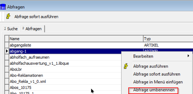 Im Abfragemenü wurde eine neue Funktion hinzugefügt. Sie ermöglicht es Ihnen, Abfragen einfach im Dialog umzubenennen und so Ihre Arbeit besser zu organisieren. Diese neue Funktion ist über das Kontextmenü zugänglich, das Sie mit der rechten Maustaste (RMT) öffnen können. Bitte beachten Sie, dass die Umbenennung nur für benutzerdefinierte Abfragen verfügbar ist und nicht für Standard-Libri-Abfragen gilt.