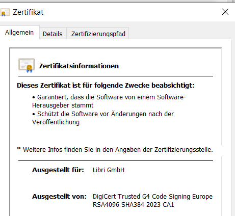- Verbesserte Sicherheit: Die digitale Signatur gewährleistet die Authentizität und Integrität unserer Software. Sie können sicher sein, dass die von Ihnen verwendete Version des JWWS tatsächlich von Libri stammt und nicht manipuliert wurde.