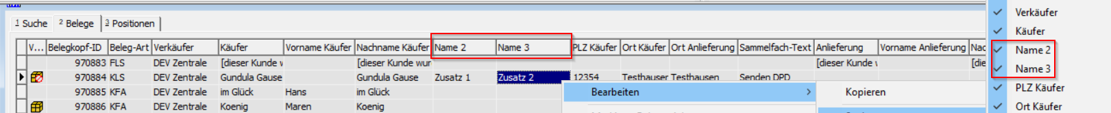 Blenden Sie auf Wunsch zusätzliche Spalten "Name2" und "Name3" des Käufers im Versandvorrat und in der Belegsuche ein.