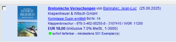 Ab sofort bleibt Ihre gewählte Sortierung auch dann bestehen, wenn Sie zusätzliche Filter anwenden. Dies gilt für alle Spalten, einschließlich der Sortierung nach Bandnummern in Buchreihen. Suchen Sie beispielsweise nach einer Buchreihe wie "Kommissar Dupin" dann ist das Ergebnisse nach Bandnummer sortiert. Diese Sortierung bleibt erhalten, selbst wenn Sie anschließend weitere Filter wie "Sofort lieferbar" hinzufügen. Diese Funktion ermöglicht es Ihnen, Ihre Suche präzise zu verfeinern, ohne die gewünschte Sortierreihenfolge zu verlieren.