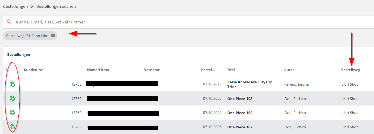 Genau wie an Ihren in der Buchhandlung getätigten Bestellungen sehen Sie die Status der Shopbestellungen.