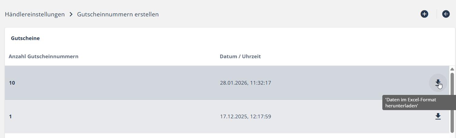 Über das Downloadsymbol am Ende der Zeile können zu jeder Erstellung die jeweiligen Gutscheinnummern inkl. zugehöriger PIN als Exceldatei heruntergeladen werden.