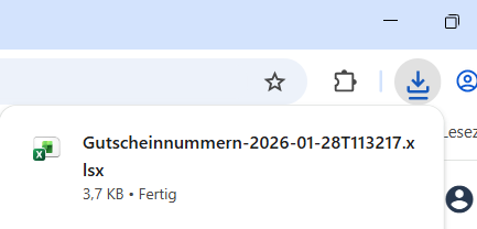 Aus dem Dateinamen geht der Zeitpunkt der Gutscheinnummernerstellung hervor, es wird also Datum/Uhrzeit wie in der Liste angezeigt, z.B. Gutscheinnummern-2025-11-09T190005.xlsx.