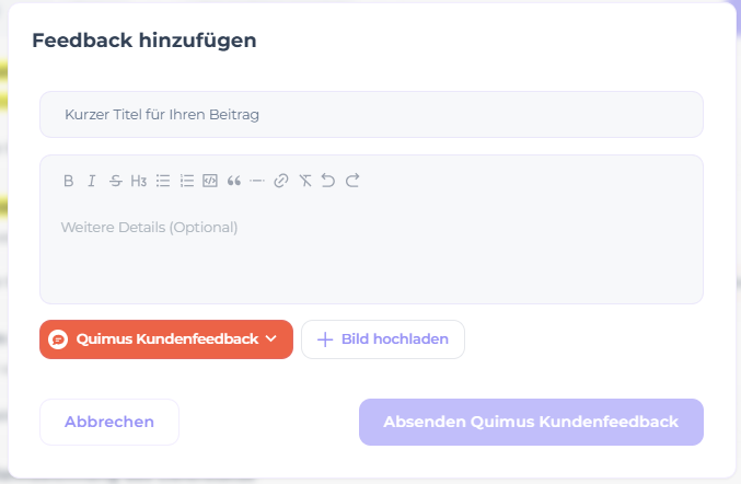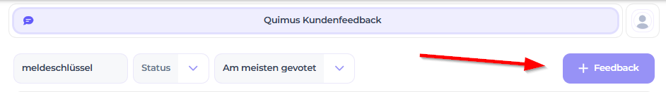 Möchten Sie einen neuen Beitrag, also einen neuen Featurewunsch einreichen, öffnen Sie über die lila farbige Schaltfläche "+Feedback" das Eingabefenster.
