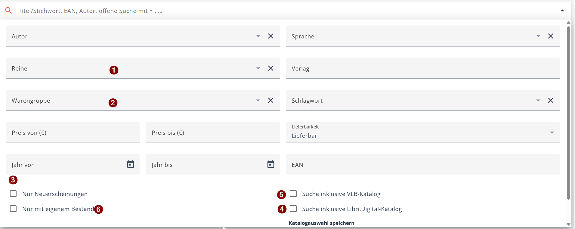 - Um nur Artikel angezeigt zu bekommen, die Sie in Ihrem eigenen Bestand haben, aktivieren Sie die Checkbox "Nur mit eigenem Bestand". Um die aktivierten Kataloge (VLB und Digital-Katalog) immer beim Suchen mit einzubeziehen, klicken Sie auf "Katalogauswahl speichern".