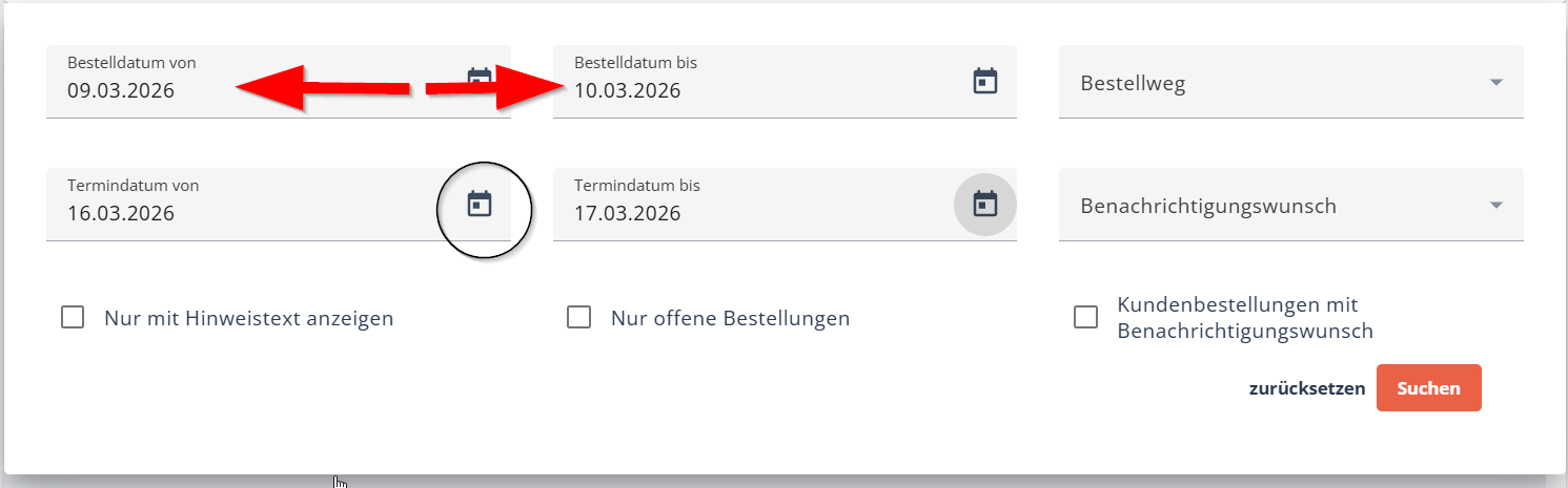Bei der Suche mit dem Bestelldatum beachten Sie, dass es technisch nicht möglich ist, das "Bestelldatum von" und "Bestelldatum bis" mit dem gleichen Datum zu suchen. Bitte wählen Sie immer Daten aus, die mindestens zwei Tage umfassen. Nutzen Sie gerne die Kalenderfunktion neben den Feldern.