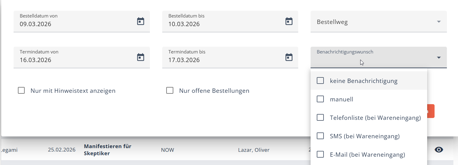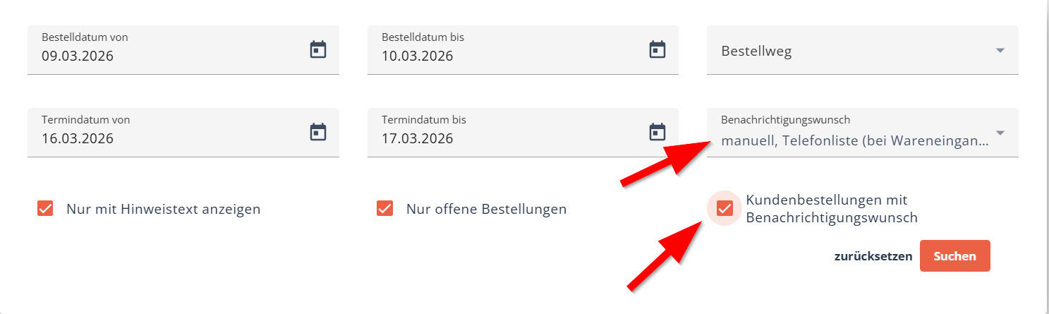 Erweitert zum Benachrichtigungswunsch können Sie einfach die Checkbox bei "Kundenbestellungen mit Benachrichtigungswunsch" aktivieren, dann wird das Feld "Benachrichtigungswunsch" automatisch mit den Benachrichtigungsformen gefüllt, die Sie aktiv erledigen müssen.