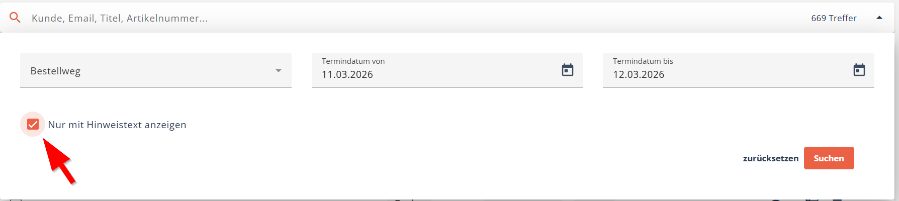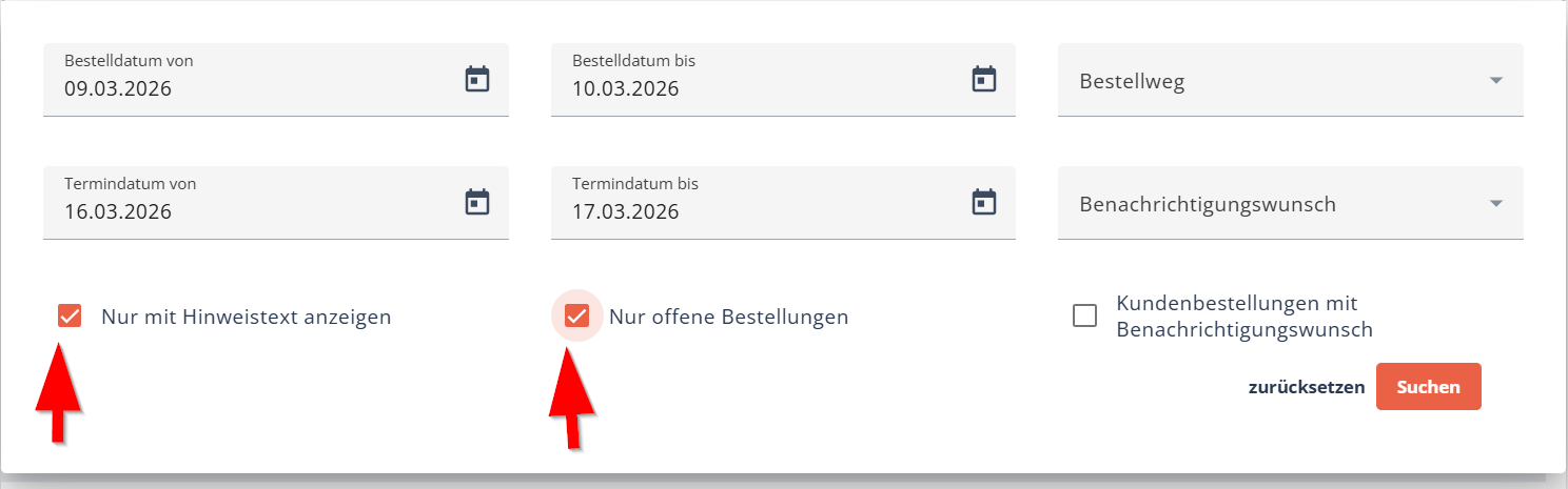 Um alle Bestellungen mit Hinweistext angezeigt zu bekommen, aktivieren Sie die Checkbox.