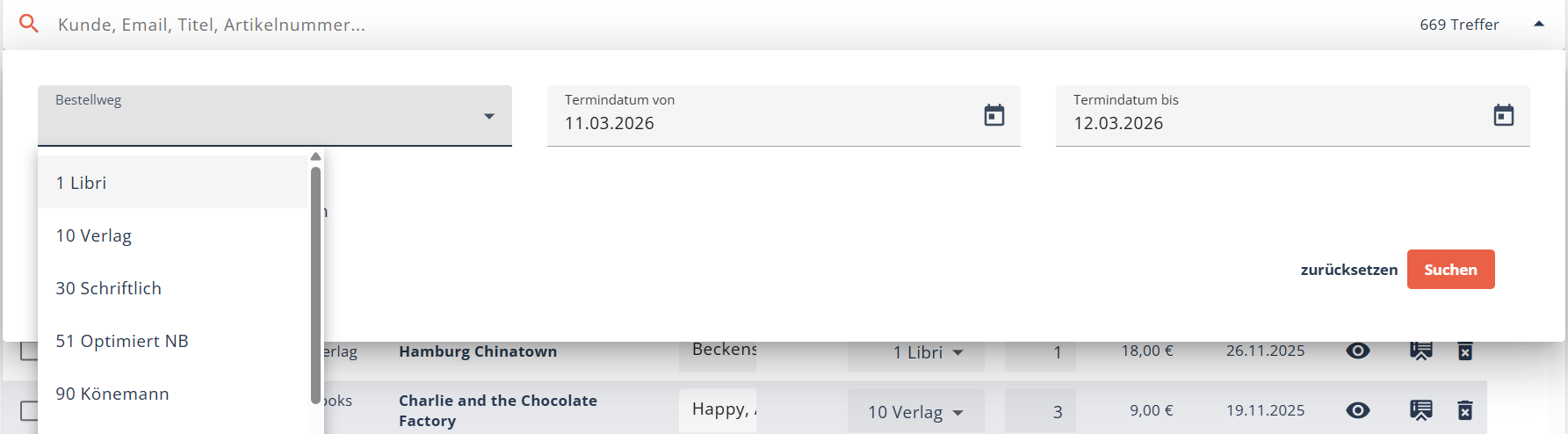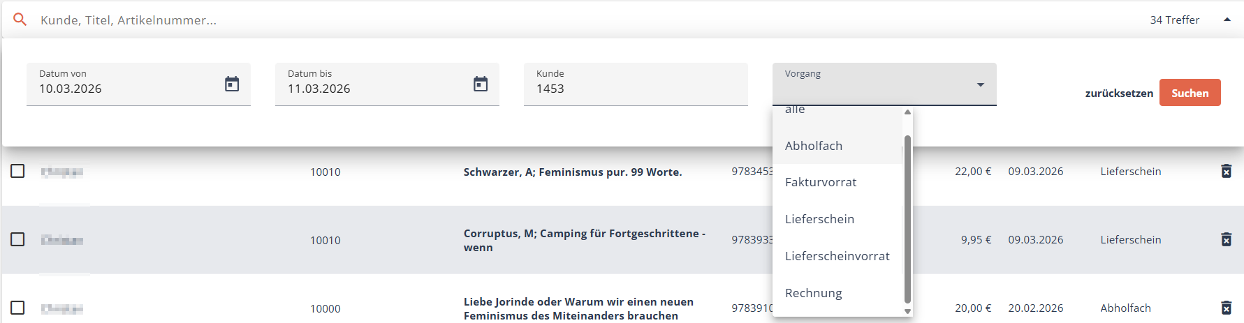 Bei der Remission können Sie die erweiterte Suche nutzen, um Rücksendungen aus einem bestimmten Zeitraum zu suchen.