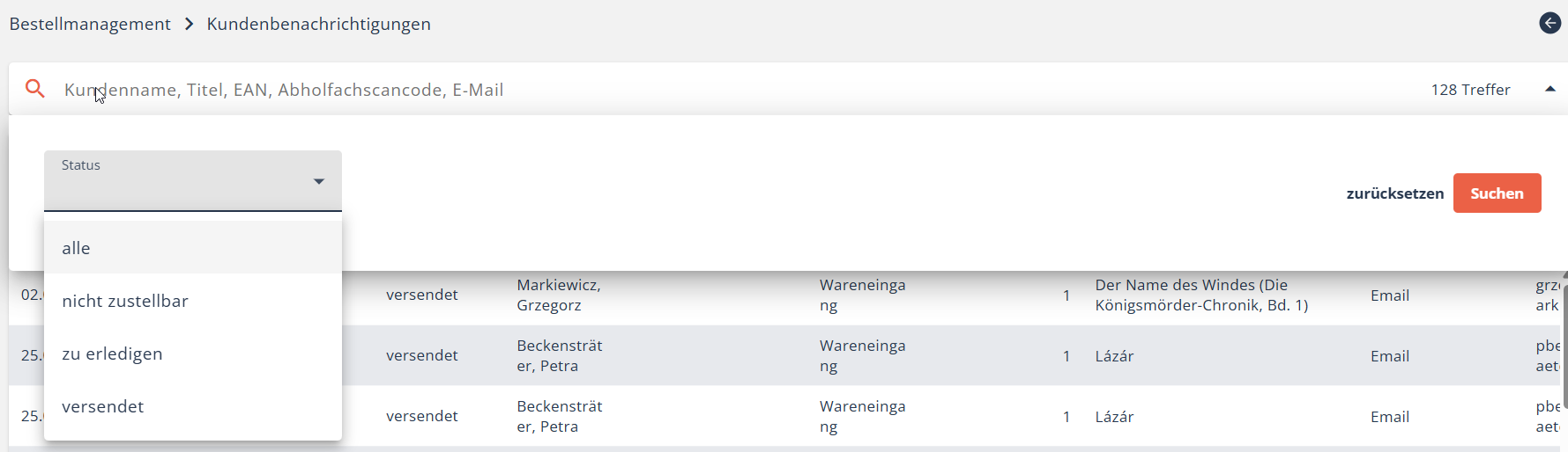 Sie können auch danach filtern, ob und über welchen Weg (Benachrichtigungswunsch) Kund*innen beim Wareneingang benachrichtigt werden möchten.