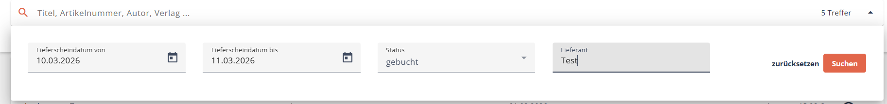Im Wareneingang nutzen Sie die erweiterte Suche, um Lieferscheine aus einem bestimmten Zeitraum zu suchen. Auch nach dem Status oder Lieferanten können Sie suchen.