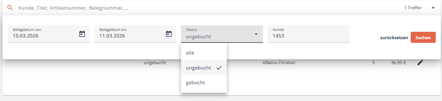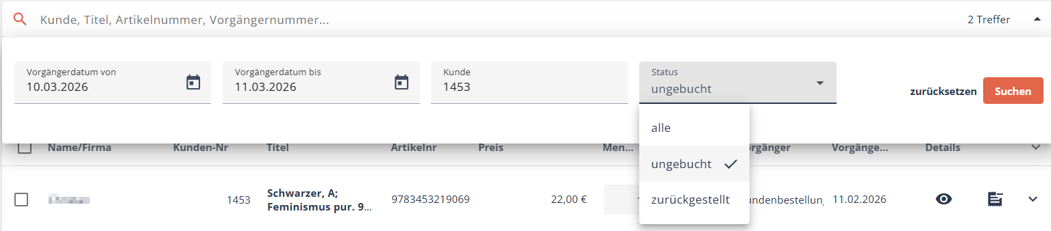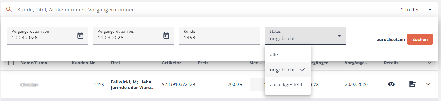 Ebenfalls können Sie nach einem bestimmten Kunden suchen (entweder mit der Kundennummer oder dem Namen). Der Status hilft Ihnen, ungebuchte (also noch zu buchende) bzw. zurückgestellte (also nicht mehr gewünschte) Positionen anzeigen zu lassen.
