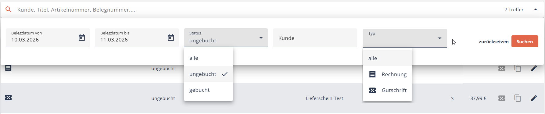 Um nur nach Rechnungen bzw. nur nach Gutschriften zu suchen, nutzen Sie den Filter "Typ".