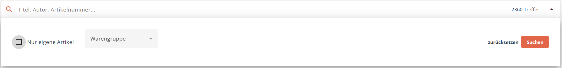 Bei den Artikeln können Sie mithilfe der erweiterten Suche auf Ihre eigenen Artikel filtern oder auch auf alle Artikel aus einer bestimmten Warengruppe, Sie können natürlich auch beide Filter kombinieren.