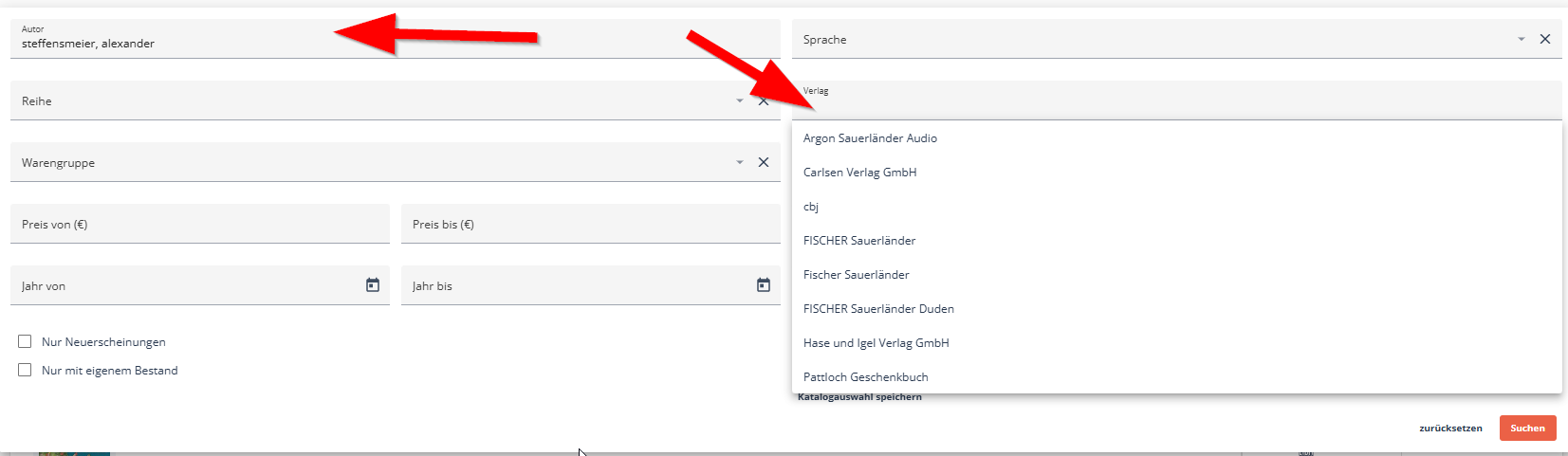 Lösen Sie die Suche dann aus und gehen erneut in die erweiterte Suche, um den Verlag zusätzlich zu filtern, werden Ihnen nur noch die Verlage angezeigt, bei denen der Autor/die Autorin publiziert hat.