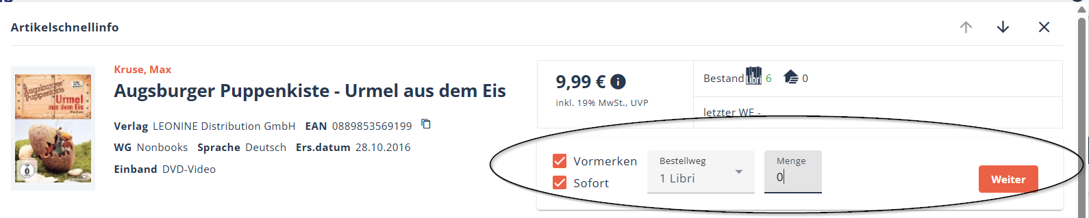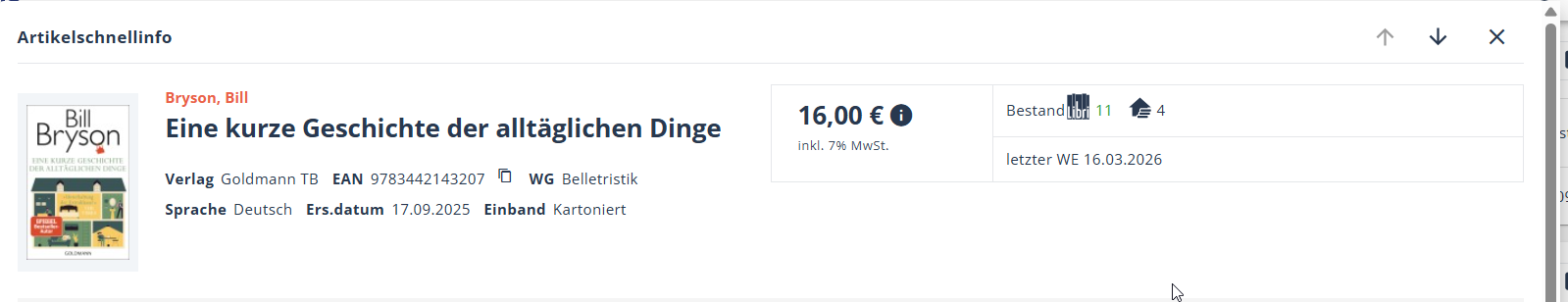 Im oberen Bereich der Artikelschnellinfo wird immer das Coverbild, die wichtigsten bibliografischen Angaben, der Preis und der Mehrwertsteuersatz, der Bestand bei Libri bzw. dem Anabel-ZL, ggf. der Meldeschlüssel und der letzten WE angezeigt.