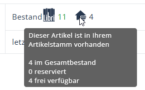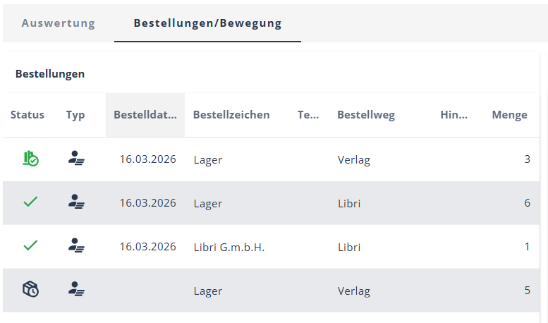 Bei "Bestellt" wird durch ein Paket-Symbol angezeigt, falls es noch Bestellungen im Bestellvorrat gibt. Gehen Sie mit der Mouse über das Symbol, wird angezeigt, wie viele Exemplare im Bestellvorrat liegen und wie viele Bestellungen bereits ausgelöst sind.