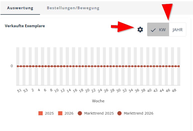 Standardmäßig wird die Auswertung nach Kalenderwochen angezeigt, Sie können aber auch auf Jahresebene wechseln, dann bekommen Sie die Abverkäufe nach Monaten angezeigt. Über das Zahnrad neben den Zeiträumen können Sie den Markttrend deaktivieren.