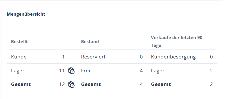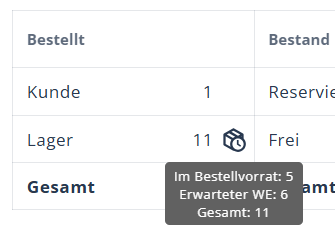 Die Menge bei Ihrem Bestand zeigt immer den freien Bestand an. Um den Gesamtbestand zu sehen, gehen Sie mit der Mouse einfach über das Häuschen. Mehr Infos zur Bestandsanzeige können Sie hier nachlesen: Bestandsanzeige.