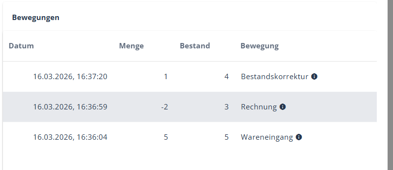 Im rechten Bereich werden die Bewegungen (Buchungen) des Artikels angezeigt. Dargestellt wird das Datum samt Uhrzeit, die Buchungsmenge, den daraus resultierenden Bestand und die Bewegungsart.