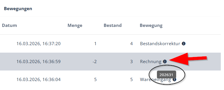 Über das kleine I an der Bewegungsart können Sie, wenn Sie mit der Mouse drüber gehen, die Vorgangsnummer (z.B. Lieferscheinnummer bei WE) sehen.